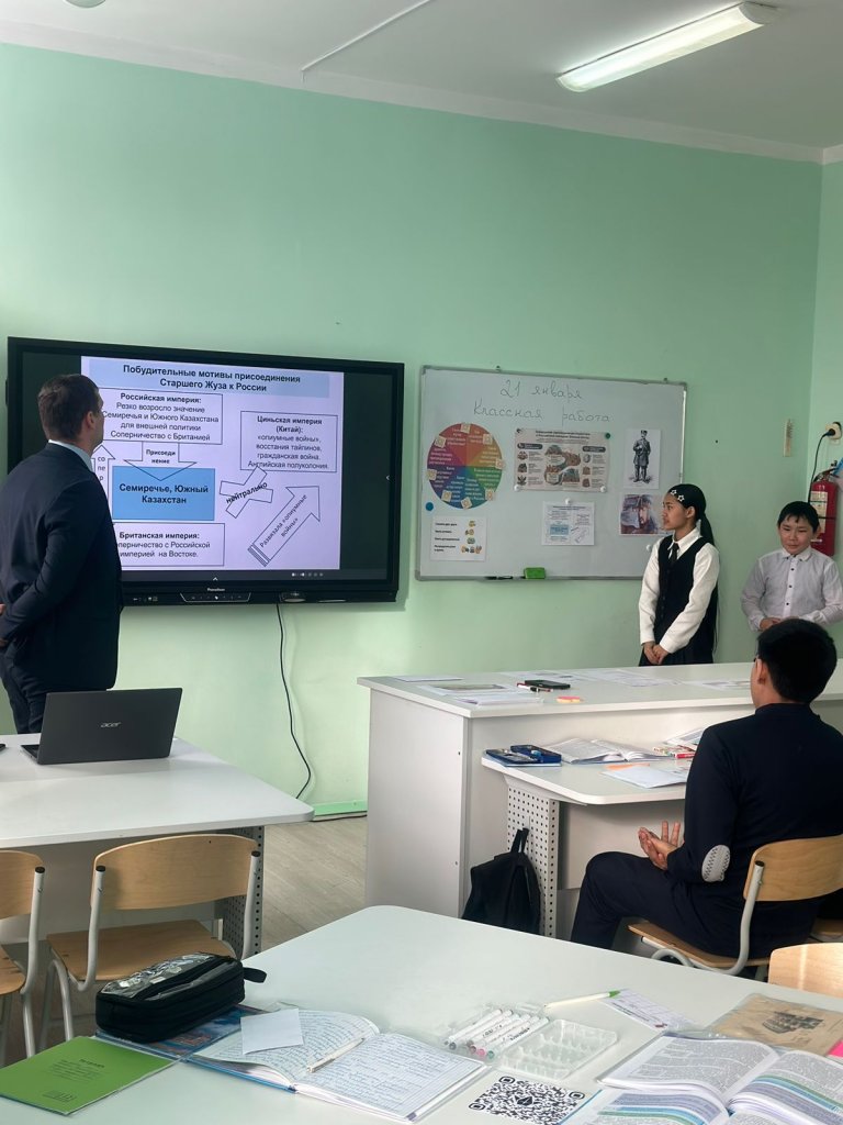 Бүгін 7 «Б» сыныбында «Қазақстанның Ресей империясына қосылуының аяқталуы» тақырыбында Қазақстан тарихы пәнінен сабақ өткізілді. Сабақ барысында оқушылар аталған тарихи кезеңнің негізгі оқиғаларын, қосылудың себептері мен салдарын, сондай-ақ оның Қазақстанның әлеуметтік-саяси және экономикалық дамуына тигізген әсерін қарастырды.